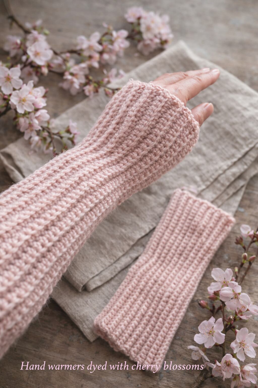 桜染めのウール糸を使用した、ハンドウォーマーです。